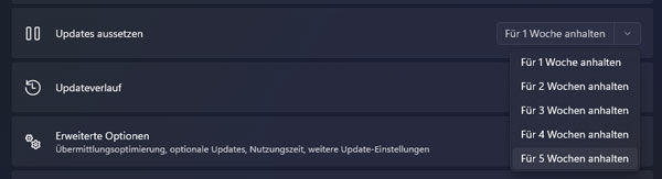"Updates aussetzen" auf den kleinen Pfeil und wählen Sie die Option "Für 5 Wochen anhalten".